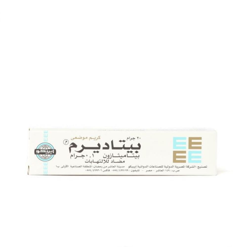 يتاديرم، كريم، مضاد للإلتهاب - 20 جم وصف المنتج: ينتمي بيتاديرم إلى فئة من الأدوية تعرف باسم ”الكورتيكوستيرويدات الموضعية“، والتي تعمل على تقليل التهاب الجلد والحكة والاحمرار. يتم استخدامه لعلاج بعض الحالات الجلدية، مثل الأكزيما (حالة جلدية شائعة مصحوبة بحكة واحمرار) وبعض حالات التهاب الجلد.