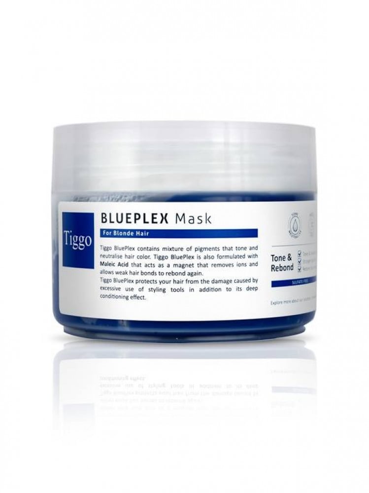 - يحتوي ماسك BluePlex على حمض الماليك الذي يساعد على إعادة بناء الروابط داخل الشعر.