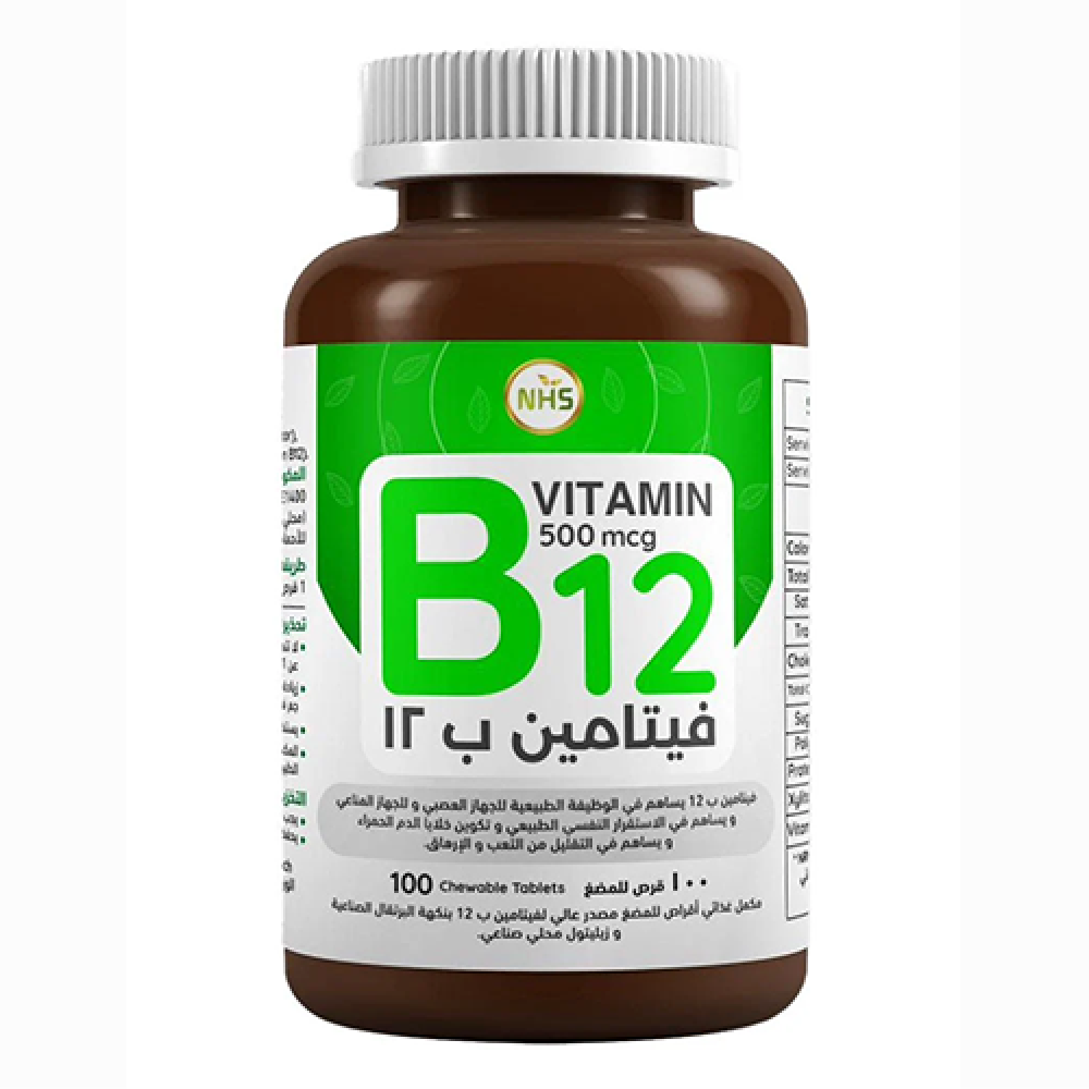 • Nhs Vitamin B12 500mcg 100 Chewable Tablets هو مكمل غذائي يحتوي على جرعة عالية من فيتامين ب 12 (كوبالامين).